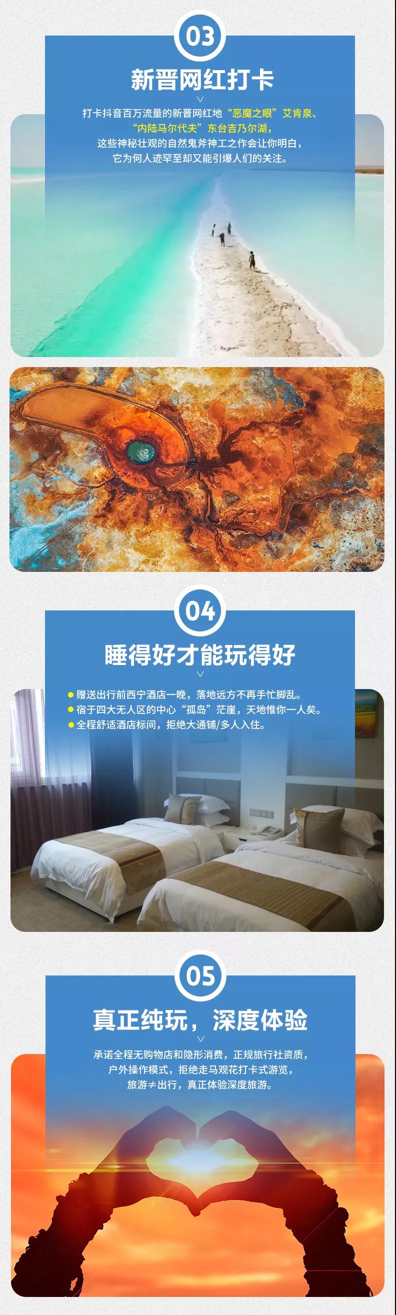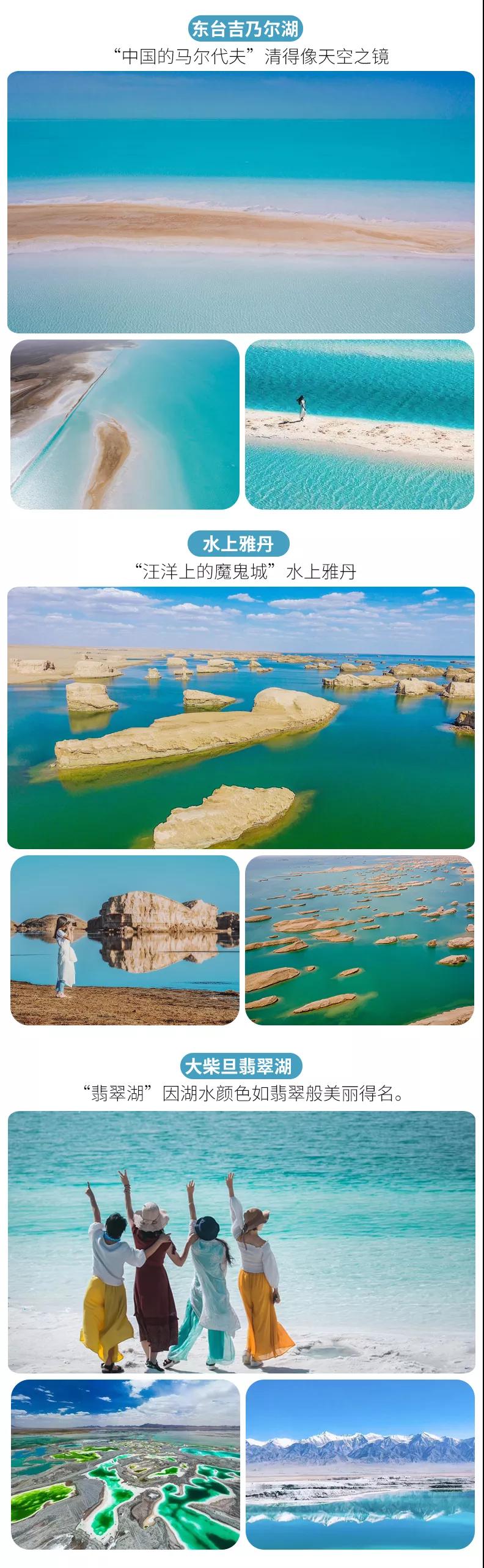 (4)茫崖翡翠湖、東臺(tái)吉乃爾湖、艾肯泉等尚未設(shè)立為景區(qū),但如當(dāng)?shù)厝耸杖…h(huán)保費(fèi)等費(fèi)用與我方無(wú)關(guān),望您諒解。