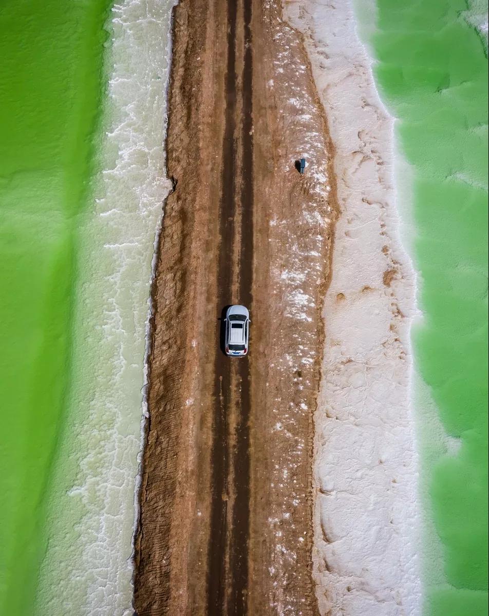 東臺(tái)吉乃爾湖的神奇之處在于一條泥路將湖水一分為二,一半是純正的蒂芙尼藍(lán),一半是含鹽量極高的純粹綠;乃爾湖岸邊盡是覆蓋著的白色結(jié)晶,湖周圍是大片的雅丹地貌,搭配上顏色干凈到極致的湖水、西北特有的廣闊無(wú)垠的天空,純粹而強(qiáng)烈的視覺(jué)沖擊,這方圓百里大漠戈壁無(wú)人區(qū)的珍寶明珠,這只屬于大自然的神秘顏色,讓你仿若來(lái)到了世界的盡頭,讓你感受一種歸于自然的內(nèi)心平靜。