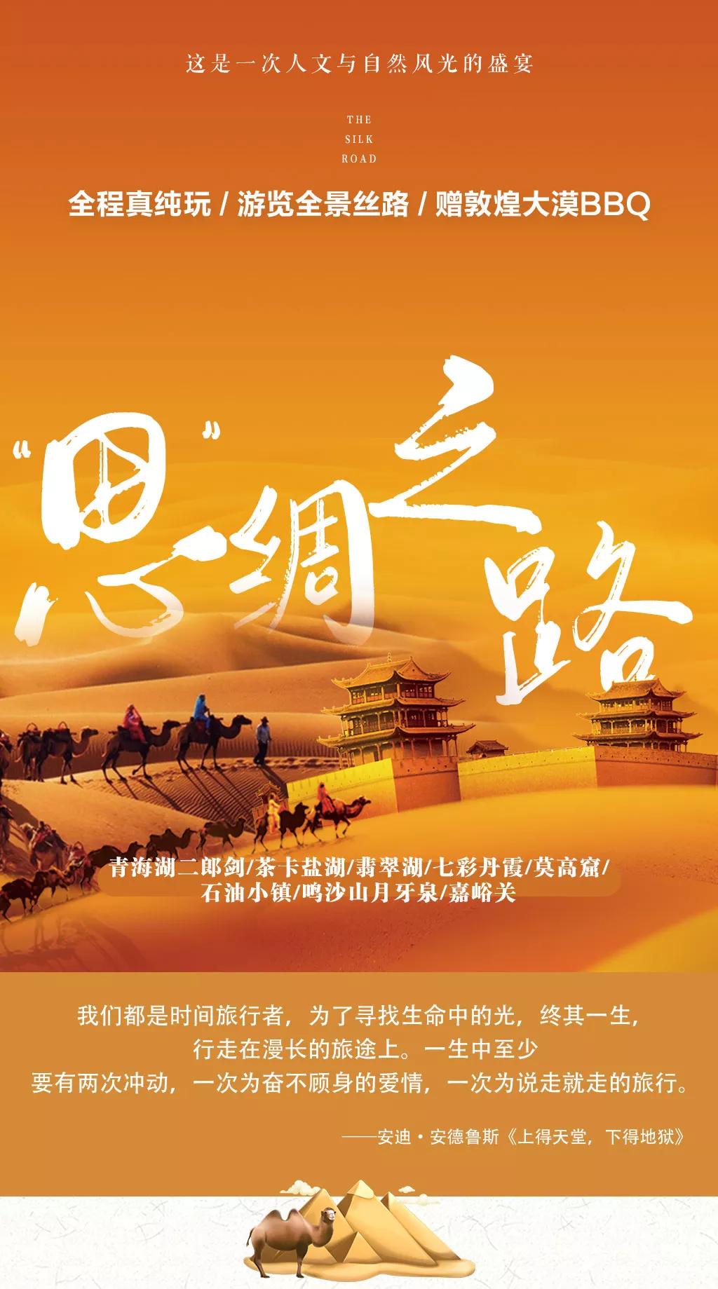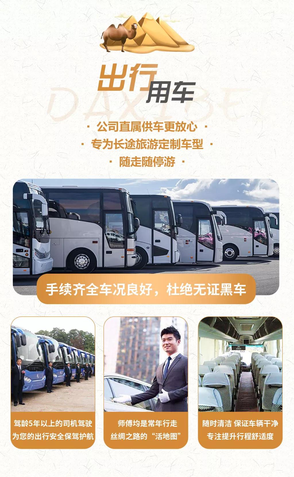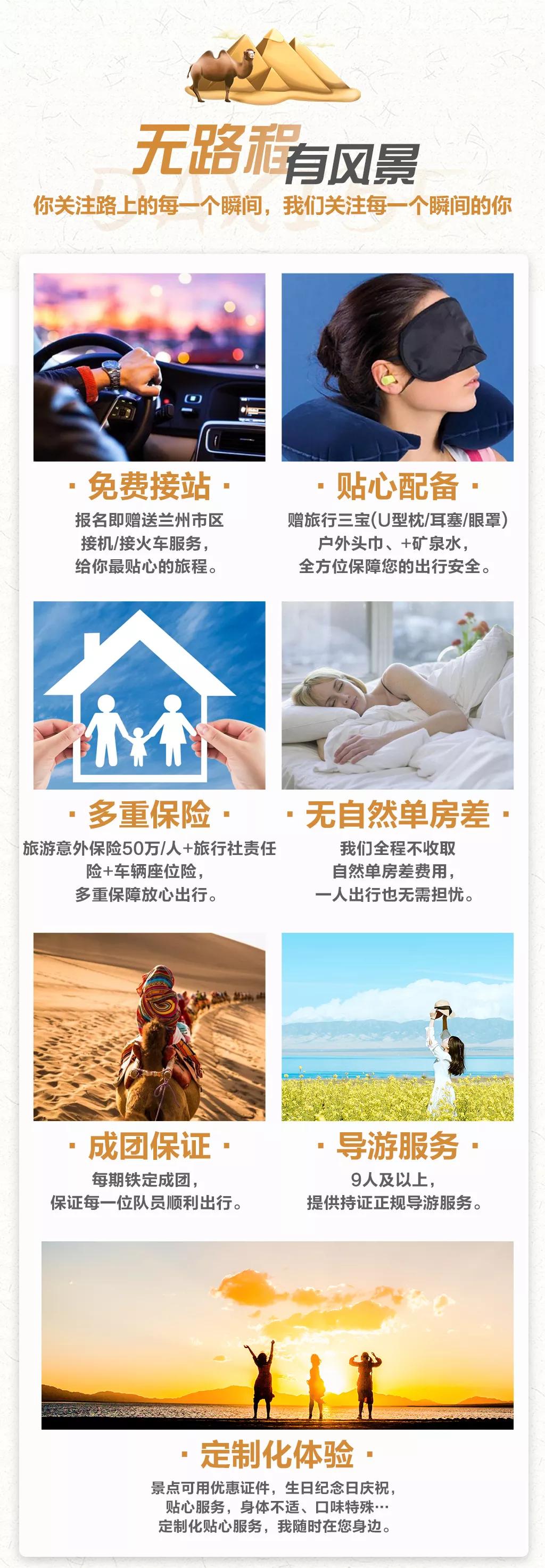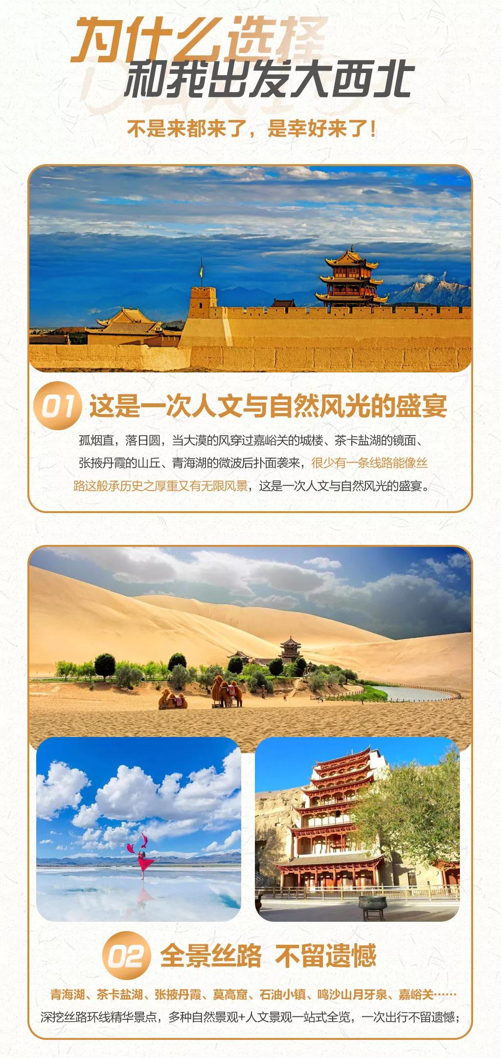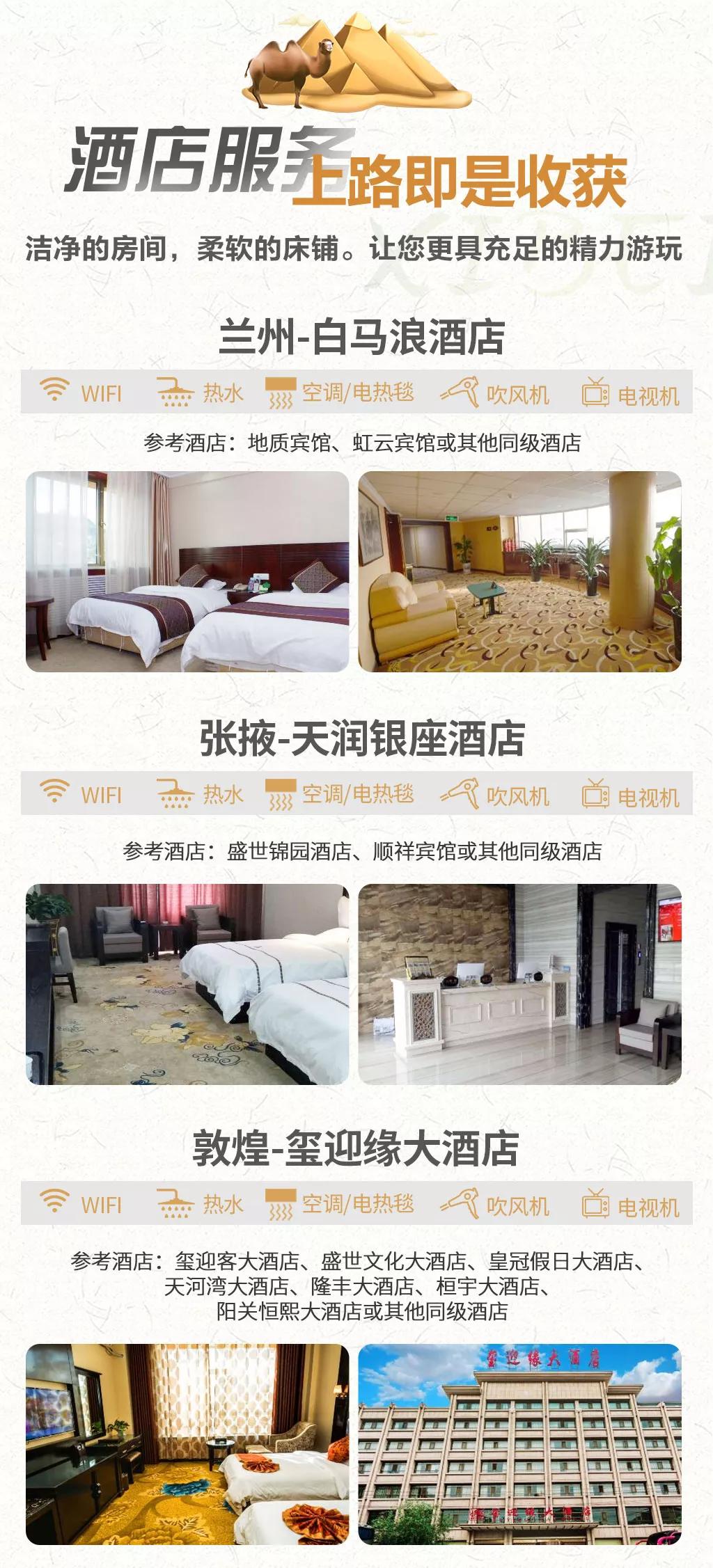 溫馨提示:西北地區(qū)天氣干燥,旅途的過程中請(qǐng)大家多喝水,注意防曬;敦煌《又見敦煌》演出,旅游淡季298元/人,旺季368元/人起;果木烤全羊費(fèi)用根據(jù)羊的大小決定,由參與活動(dòng)的游客均攤,一般10人一桌,人均消費(fèi)160元左右。