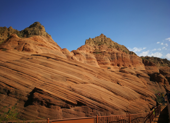早餐后乘車(chē)約2.5小時(shí)150公里赴波浪谷景區(qū)走進(jìn)被譽(yù)為中國(guó)最美的【波浪谷】自理項(xiàng)目電瓶車(chē)50元,一起去感受大自然的鬼斧神工。龍洲紅砂巖位于靖邊縣龍州鄉(xiāng),是由紅色的砂巖構(gòu)成的特殊丹霞地貌,在長(zhǎng)期的風(fēng)力和雨水的沖刷下形成溝壑、波浪起伏的山丘狀,因砂巖上的紋路像波浪,人稱(chēng)“波浪谷”。遠(yuǎn)遠(yuǎn)望去,這些紅色石頭就像泥石流一樣呈現(xiàn)出一種流水狀,一圈圈、一彎彎的向溝壑中涌去,好像滔滔的黃河,洶涌奔騰,也有人把這里譽(yù)為”中國(guó)的科羅拉多”。靖邊波浪谷巖石學(xué)術(shù)上被稱(chēng)為“砒砂巖”,成于古生代二疊紀(jì)和中生代三疊紀(jì)、侏羅紀(jì)、白堊紀(jì)之間。這是地球歷史中地質(zhì)最活躍、生物最繁茂、動(dòng)物最龐大的時(shí)代。砒砂巖像綻放的罌粟花般美麗,壯觀(guān),誘人,無(wú)水堅(jiān)硬如石,遇水松軟如泥。