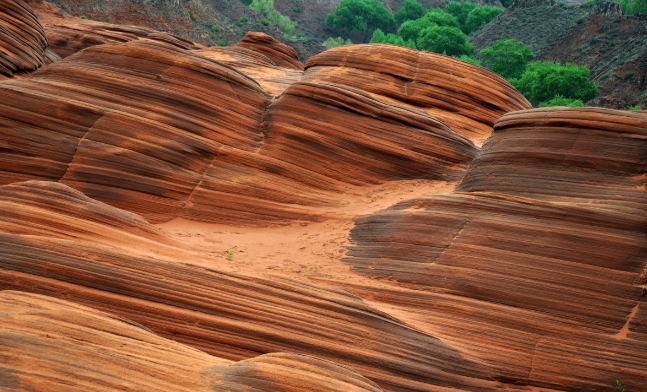 波浪谷展示的是由數(shù)百萬(wàn)年的風(fēng)、水和時(shí)間雕琢砂巖而成的奇妙世界。層層疊疊的石頭就像一大批鋪蓋在地面上浸染過(guò)后晾曬的紅色布匹,一層層、一卷卷、一盤(pán)盤(pán)在夕陽(yáng)的渲染之下,異常的鮮紅; 與溝底一處處流淌細(xì)小的河水和遠(yuǎn)處覆滿(mǎn)綠色植被山頂上轉(zhuǎn)動(dòng)的風(fēng)車(chē)構(gòu)成了一幅優(yōu)美的實(shí)景畫(huà)。
