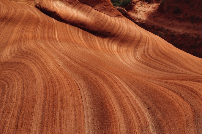 美西和陜北波浪谷,都是古老的沙丘隨著平原的上升,加上漫長(zhǎng)的風(fēng)蝕,水蝕,峽谷里砂巖的層次逐漸清晰地呈現(xiàn)出來(lái)。平滑的,雕塑感的砂巖和巖石上流暢的紋路創(chuàng)造了一種令人目眩的三維立體效果。二者也有一定區(qū)別,美西波浪谷在紅色之間夾有白色線條,紅白相間;而陜北波浪谷則以紅色為主。