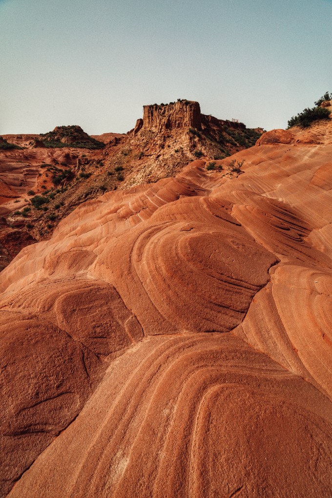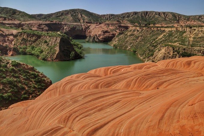 從B停車場(chǎng)出發(fā),沿小路向前走不多遠(yuǎn),前面就能看到幾個(gè)丹霞紅砂巖山丘,右手邊是土橋和大灣畔兩個(gè)水庫(kù)中間的一個(gè)過(guò)渡的水塘。在半島西北角的山坡下邊有一片水浪波紋的紅砂巖,這里是這個(gè)區(qū)域最驚艷的地方,不僅可以看到碧水藍(lán)天,還能夠眺望對(duì)面大面積的丹霞紅石,最重要的是可以近距離接觸大片波浪紋路的紅砂巖。