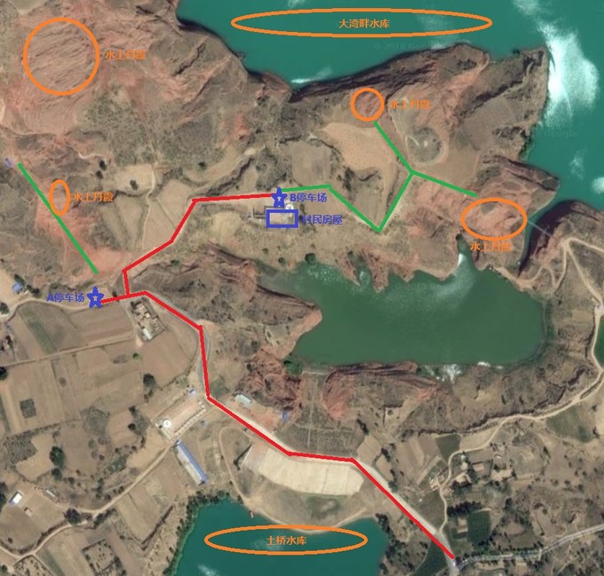 在龍州鎮(zhèn)北邊有幾處明顯的“水上丹霞”指示牌指向水上丹霞,過(guò)土橋水庫(kù)向前幾百米,A停車場(chǎng)就在路邊,停車前行就可以看見(jiàn)被圍欄圍起來(lái)的一片丹霞。B停車場(chǎng)設(shè)在當(dāng)?shù)匾粦艮r(nóng)民的院內(nèi),右手有一個(gè)農(nóng)民自己修建的岔路,進(jìn)去一兩百米就是了。