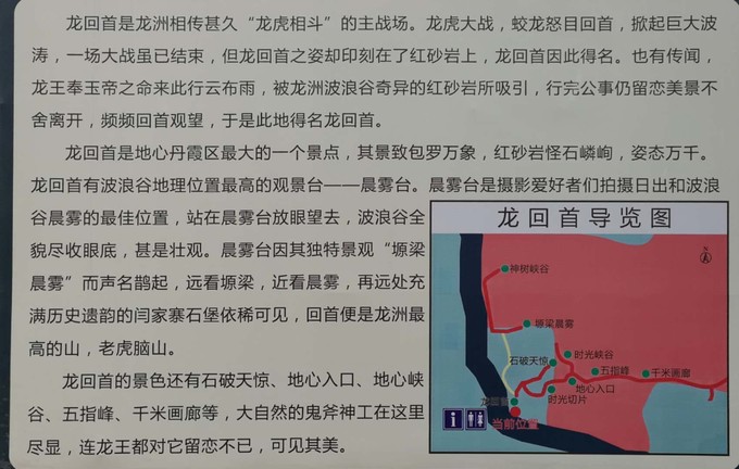 到達(dá)龍洲丹霞區(qū)域,導(dǎo)航不再起作用,主要靠當(dāng)?shù)芈放缘穆放浦敢?