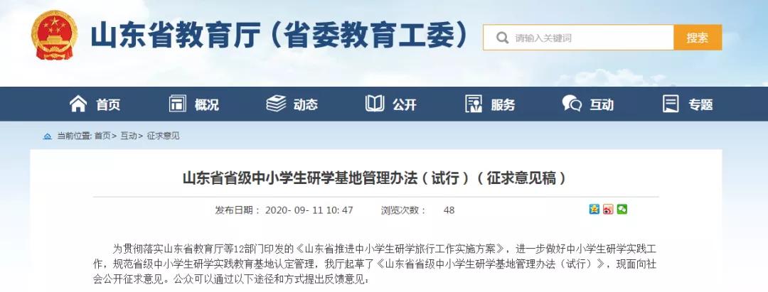第二條 山東省省級研學基地是指經(jīng)省教育廳聯(lián)合省發(fā)展改革委、省文化和旅游廳等部門評議認定,以優(yōu)秀傳統(tǒng)文化、革命傳統(tǒng)、國情、國防科工和自然生態(tài)教育為主要內(nèi)容,面向中小學生開展研學實踐活動,具有較好引領示范作用的各類教育基地、自然和文化遺產(chǎn)資源、文化場館、大型公共設施、高等院校、科研機構(gòu)、工礦企業(yè)等。