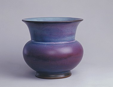 窯變釉是一種藝術釉,變化最多,色彩最豐富,形態(tài)也最復雜。它的最初出現(xiàn)完全是偶然的。人們按一定的配方,制成某些釉料,施于制品入窯焙燒后,產(chǎn)生了出乎意料之外的顏色和形態(tài),鈞窯的釉色基調(diào)是青色,偶然有在青色中出現(xiàn)或深或淺的紅色或紫色來,而這種紫色,有時像云后迸射出萬道霞光,有時像萬里晴空飄浮的彩云,變化無窮。人們對此現(xiàn)象無法解釋,就稱之為窯變。在長期實踐中,瓷工逐漸認識并掌握了銅紅的成色技藝。鈞窯的瓷工是首先運用銅紅工藝的,這說明當時已經(jīng)能充分掌握銅元素的還原技術,這是瓷藝史上的一項重大成就。鈞窯不僅開創(chuàng)了我國窯變釉瓷器的先河,而且鈞窯器物的成型和高超的燒窯技術,一直為后世贊嘆不已。