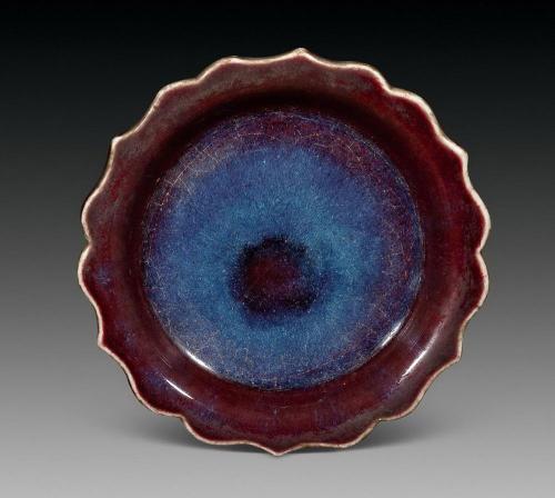 明張應文撰《清秘藏》“均州窯,紅若臙脂者為最,青若蔥翠色、紫若墨色者次之。色純而底有一二數(shù)目字號者佳,其雜色者無足取,均之釉無論深淺濃淡皆混然一律,元瓷之釉濃處有時或起條文,淺處有時仍見水浪”