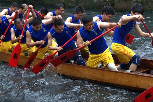 扒龍舟是端午節(jié)的一項重要活動,是古代龍圖騰祭祀的節(jié)儀,乃遺俗也。據(jù)《河姆渡遺址第一期發(fā)掘報告》稱,早在7000年前,遠古先民已用獨木刳成木舟,并加上木槳劃舟。龍舟最初是用單木舟上雕刻龍形的獨木舟,后來發(fā)展為木板制作的龍形船。
