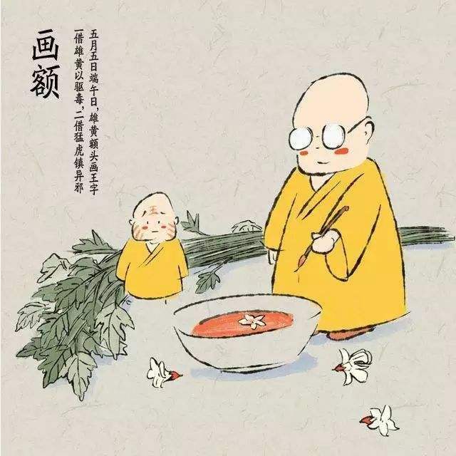 端午節(jié)時以雄黃涂抹小兒額頭的習(xí)俗,云可驅(qū)避毒蟲。典型的方法是用雄黃酒在小兒額頭畫“王”字,一借雄黃以驅(qū)毒,二借猛虎(“王”似虎的額紋,又虎為獸中之王,因以代虎)以鎮(zhèn)邪。除在額頭、鼻耳涂抹外,亦可涂抹他處,用意一致。山西《河曲縣志》云:“端午,飲雄黃酒,用涂小兒額及兩手、足心,……謂可卻病延年?!?