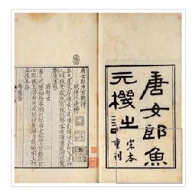 北圖所存宋本《唐女郎魚玄機(jī)詩(shī)》,乃宋陳起陳解元書籍鋪所刻,卷尾鐫有“臨安府棚北睦親坊南陳宅書籍鋪印”。此本,明代曾先后為朱承爵、項(xiàng)元汴等藏書家收藏。至1803年(清嘉慶八年),又為大藏書家黃丕烈所得。1916年(民國(guó)五年),又落入袁克文之手。其后散出,為北圖收藏,終成國(guó)家藏書。