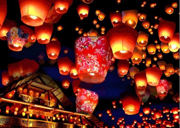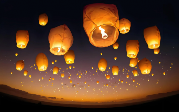 “放天燈”,來由是過去人們在躲避盜匪侵襲而四散逃逸之后,以燃放天燈為互報(bào)平安的信號。由于避難回家的日子正是元宵節(jié),從此以后,每年這一天,人們便以放天燈的儀式來慶祝,所以又稱天燈為“祈福燈”或“平安燈”。其后逐漸演變?yōu)橄蛏咸炱砀TS愿的民俗活動。天燈上寫滿了心里的各種祈愿,希望天燈能上達(dá)天庭,帶給人無限的希望和光明。