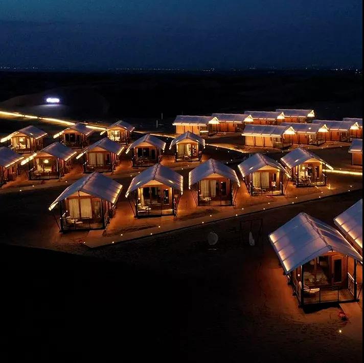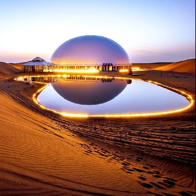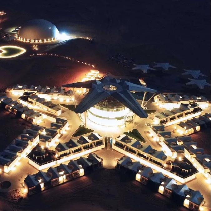 沙漠星星酒店沙漠星星酒店是國內首個以沙漠觀星為主題的酒店,它坐落在寧夏省中衛(wèi)市沙坡頭旅游度假區(qū)內,以五角星形狀規(guī)劃設計,從空中俯瞰正形如一顆顆星星。遠遠看到的第一個建筑則是一個巨大無比、白色的半球體,這是酒店的標志性建筑——星星劇場的穹頂。及至近前是起伏沙丘上的一棟棟設計感十足的精致木屋鱗次櫛比;一面全是玻璃幕墻的觀景房遙遙相對;還有星球穹頂的觀星房;“半個太陽的驚喜”落日餐廳。餓了,就來一頓獨具特色的沙漠晚餐;累了,就住在星星酒店,開啟“躺在床上數星星”的全新旅游方式。