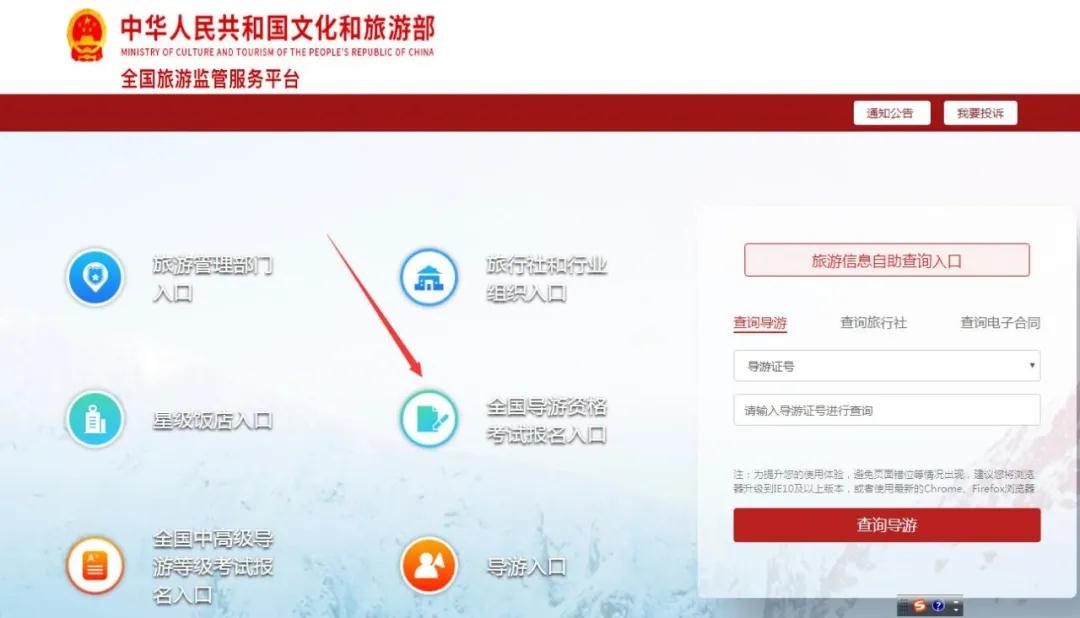 (進(jìn)入“全國旅游監(jiān)督服務(wù)平臺”,選擇“全國導(dǎo)游資格考試報考入口”入口登錄)