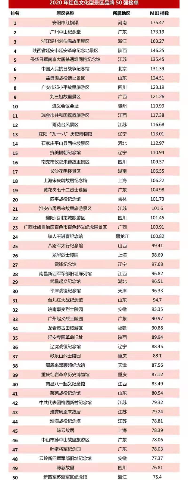 以下是「我們」獨(dú)家發(fā)布的“2020年紅色文化型景區(qū)品牌50強(qiáng)榜單”,其中安陽(yáng)市紅旗渠、廣州中山紀(jì)念堂、浙江溫州劉伯溫故里景區(qū)位列年度三甲。
