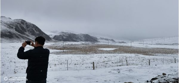 路上的雨雪下個不停。如果這樣的雨到茶卡鹽湖,別說攝影,就是參觀都不可能。人人都會落成一個落湯雞,那就沒有意義了,大家在車上商量,如果再下雨的話,就舍棄這個景點直接奔目的地。段會長說鹽湖的景色還有很多,我們就塌下心來往前走吧。雨一直在下大家心里還有不甘??床坏讲杩}湖總是一個遺憾。