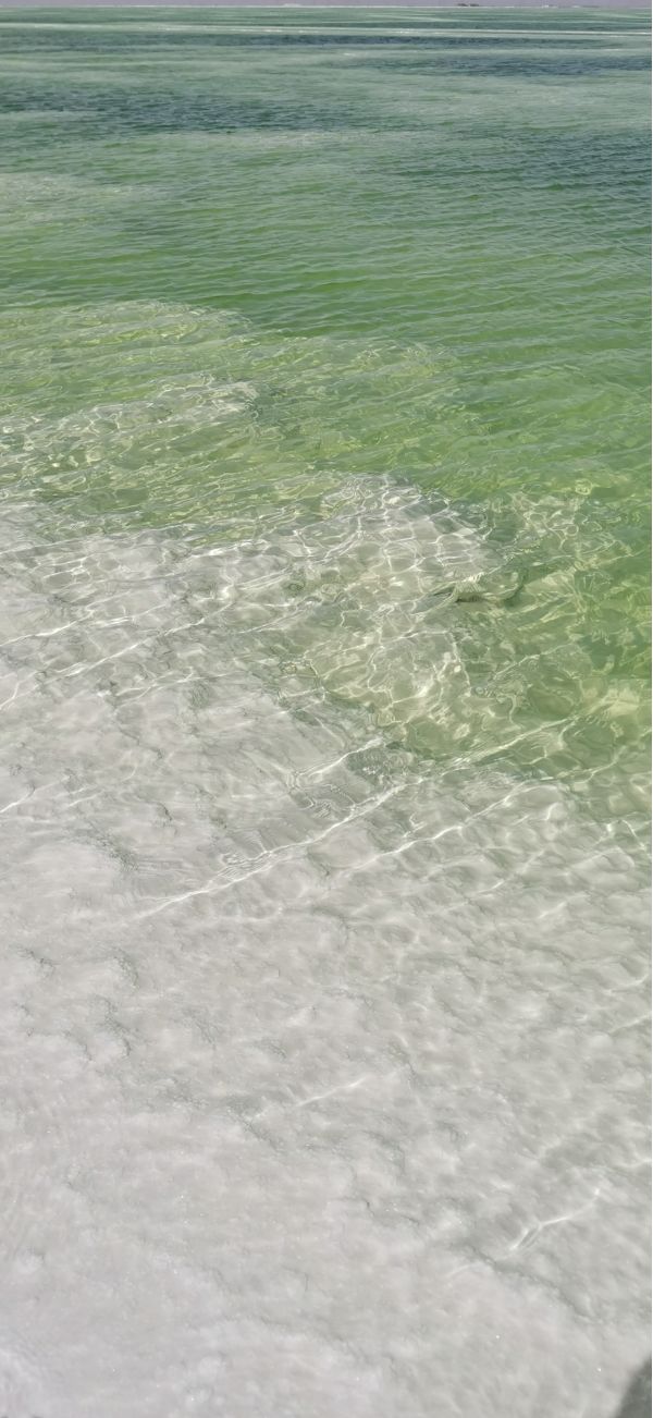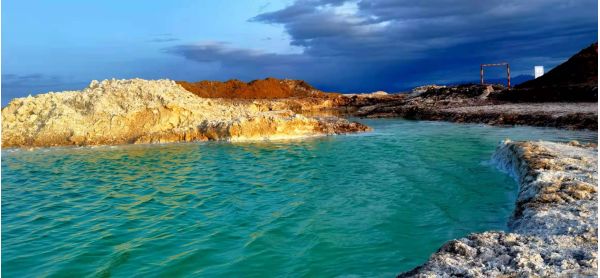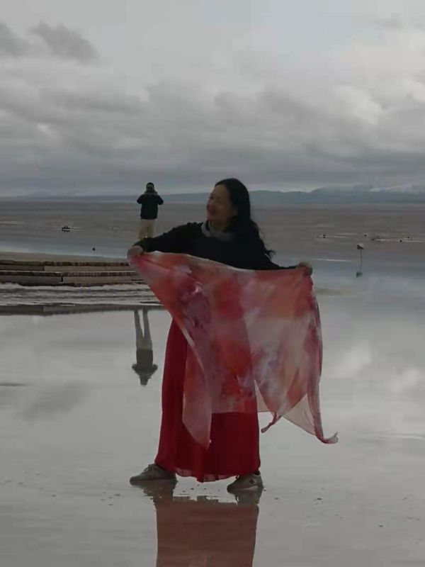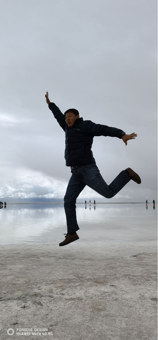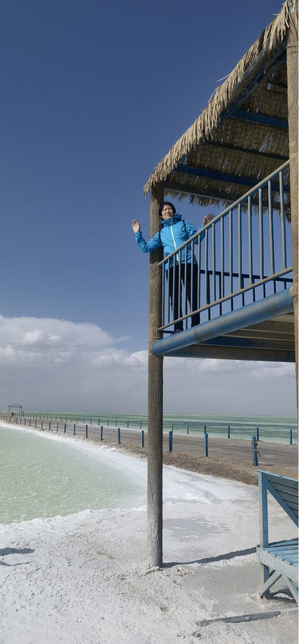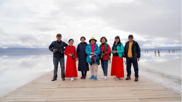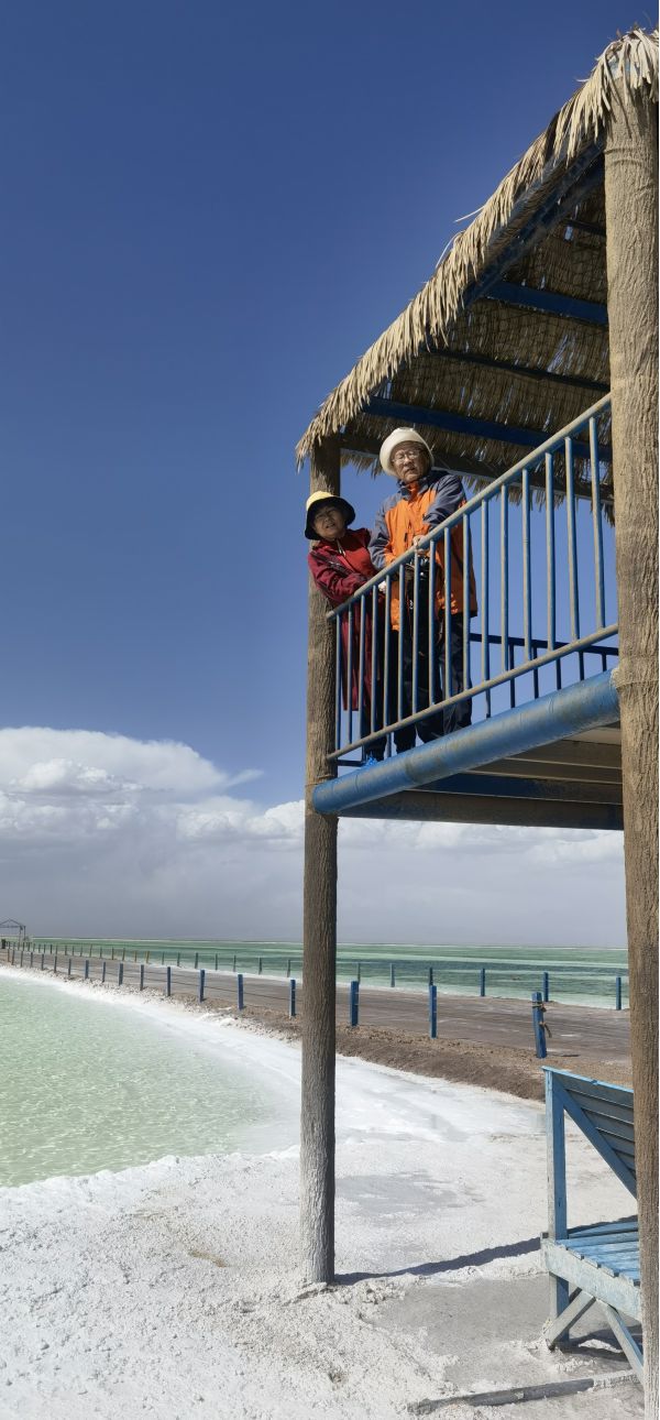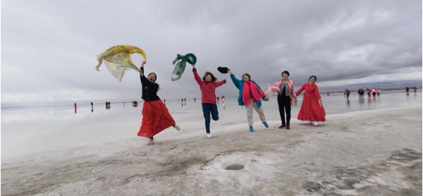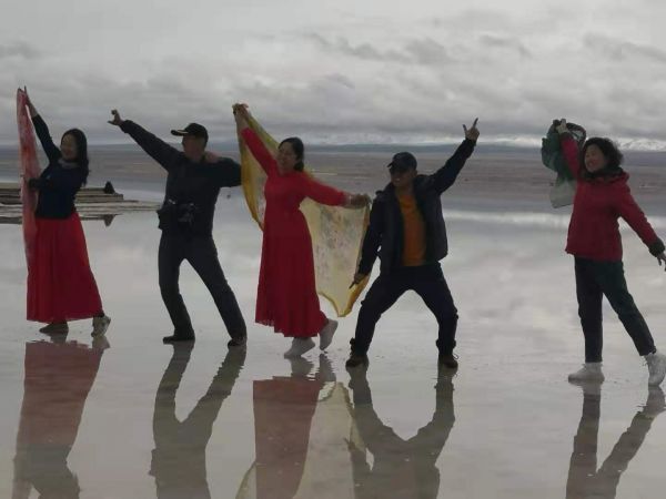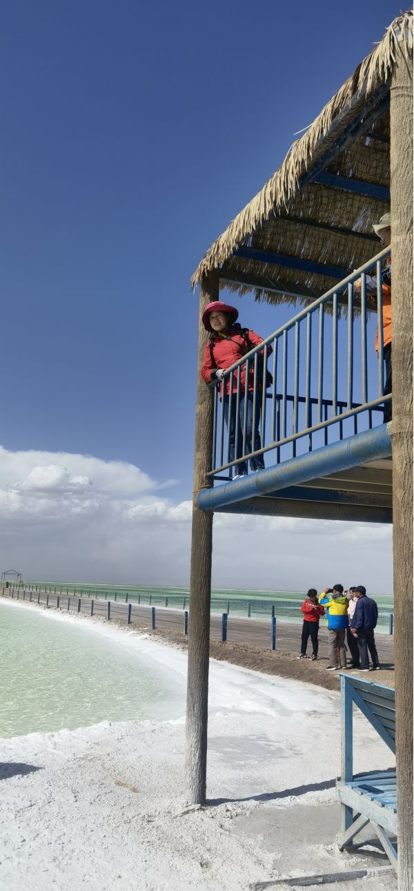 時速大約相當于人的走路的兩倍到三倍,咣當咣當?shù)故遣坏⒄`欣賞一路風景。目的地就是當年鹽場采鹽的鐵路的盡頭。鹽水很淺,風平浪靜,翠綠的鹵水倒影著遠處的雪山,風景剎是美麗,水也就是能沒到腳面,租他的膠鞋和紅色的裙子可以到鹽湖里面拍攝。紅色的裙子倒影非常漂亮,遠處的云彩黑白相間。一朵一朵相擁而來,紅色的裙子,翠綠色的湖水,藍色的天空白色的雪山,真是如入仙境,大家操作無人機上下左右拍了無死角,兩個多小時瞬間過去,說好的是5點返程,6點了大家還意猶未盡,流連忘返。
