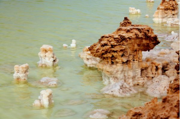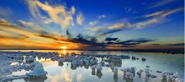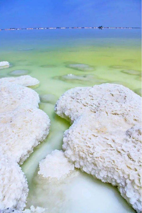 因為氣候炎熱干燥,湖水的蒸發(fā)量遠(yuǎn)遠(yuǎn)高于降水量,湖內(nèi)便形成了高濃度的鹵水,然后逐漸結(jié)晶成了鹽粒。而鹽花是鹽湖中的鹽結(jié)晶形成的特殊形狀的結(jié)晶體,由于結(jié)晶時的溫度,氣候,時間長短,濃度不同等原因,形成了各式各樣,萬千變化的美麗鹽花。生命的禁區(qū),萬物俱寂,但是唯有“鹽花”開的最旺,它就是大自然賜給人類的絕妙作品,日夜看守這片凈土。這些鹽花無需人工的雕琢,形態(tài)各異,有的宛如貝殼,有的宛如樓臺,一叢叢,一片片,一簇簇地立于鹽湖中,把鹽湖裝飾得如仙境一般。