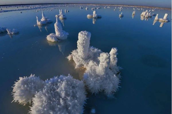 鹵水在結(jié)晶過程中因濃度不同、時間長短不一、成分差異等原因,形 成了形態(tài)各異、鬼斧神工一般的鹽花。 這里的鹽花或形如珍珠、 珊瑚,或狀若亭臺樓閣,或像飛禽走獸,一叢叢、一片片、一 簇簇地立于鹽湖中,把鹽湖裝點得美若仙境。