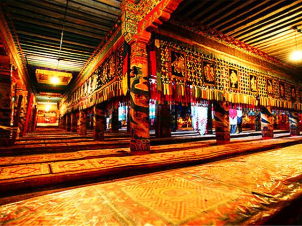大經(jīng)堂始建于明萬(wàn)歷三十四年(1606),毀于火,1917年重建。土木結(jié)構(gòu),為藏式雙層平頂建筑,漢式樓閣遙相互映。經(jīng)堂面闊十三間,進(jìn)深十一間。面積1981平方米。堂內(nèi)四壁存放著數(shù)百冊(cè)經(jīng)卷。