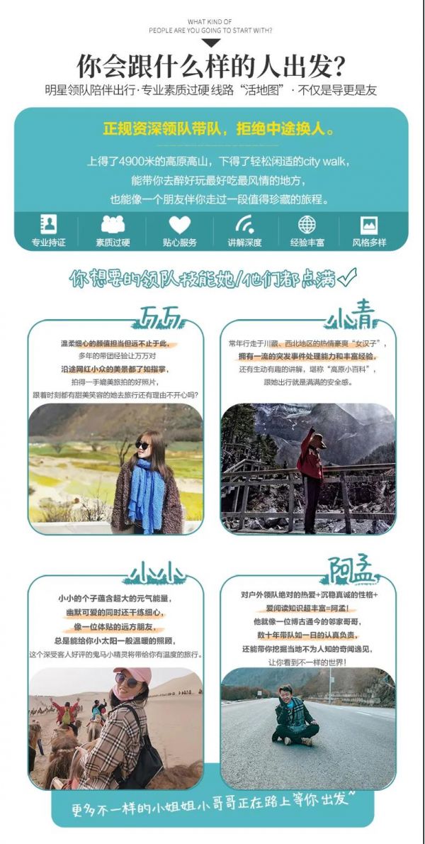 私人訂制:我們業(yè)務(wù)范圍囊括了全國各大城市,川西、西北、東北,在路上永遠(yuǎn)有我們的身影。我們將為每一個(gè)有定制需求的你策劃出獨(dú)屬于自己的完美旅行。