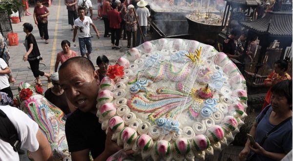 全天記錄"暖壽節(jié)"活動,今天正五月二十五是碧霞元君的壽誕日,數(shù)萬各地香客都前來祝壽。每年的這個時候,來碧霞宮還愿、進香的信眾,從早到晚,徹夜不絕,山上山下,連稱一片。在這里人們席地而坐,相互拉拉家常,有的在疊紙元寶,有的躺在席上休息。數(shù)萬民眾祈福納祥。人們每年都帶著美好的心愿來到浮丘山朝拜、暖壽,希望能夠得到“老奶”的庇佑,祈盼自己的心愿能夠?qū)崿F(xiàn)。