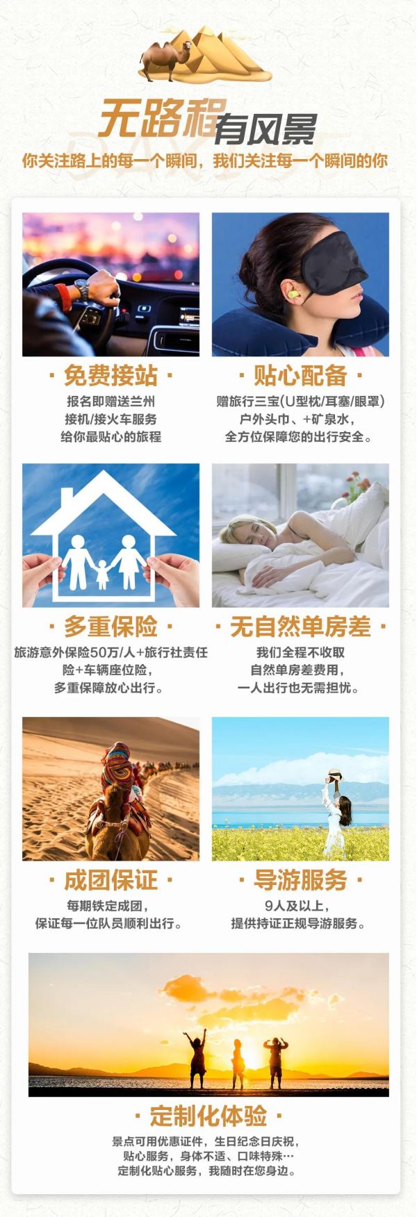 (5)贈送蘭州市區(qū)接機/接火車服務(wù),23點后由于運管規(guī)定不能接機/接站,敬請諒解;