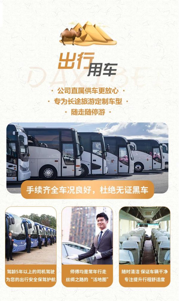 交通:全程正規(guī)空調(diào)旅游車出行,保證一人一正座位,車型大小根據(jù)實際人數(shù)安排,且由駕駛經(jīng)驗豐富的司機為您的出行保駕護航,報價包含車費、油費、停車費、維修費及司機勞務(wù)費。