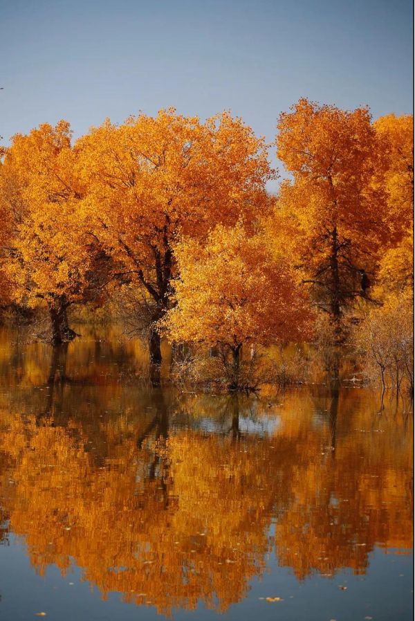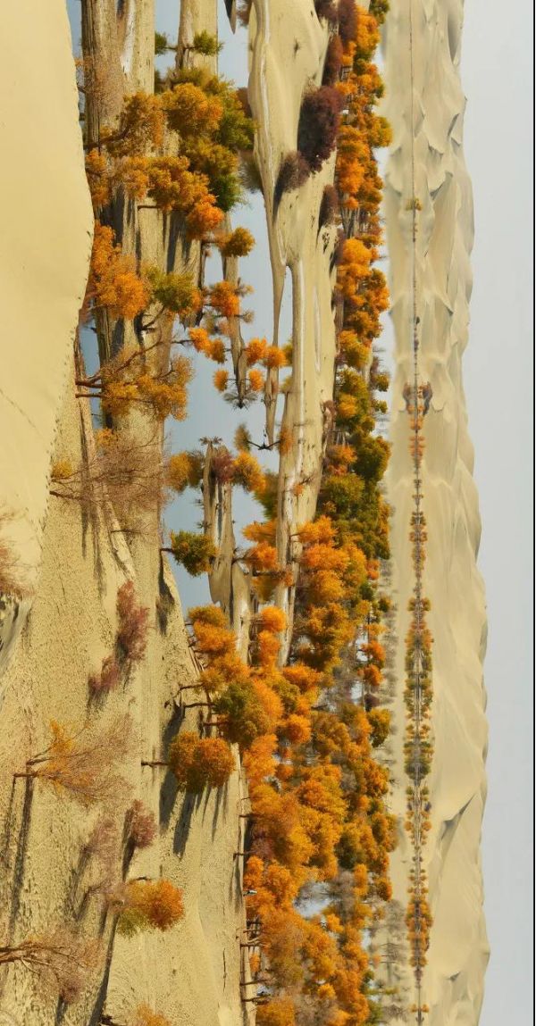 她雖身處于中國流動最大的塔克拉瑪干沙漠,但依舊樂觀。用耀眼、跳躍的金黃點綴了滿目荒蕪的漠黃。 她雖然身處沙漠,心中卻似乎向往水鄉(xiāng)。因為這兒,有著涓涓河流,金黃潑在兩岸,身影倒映水中。