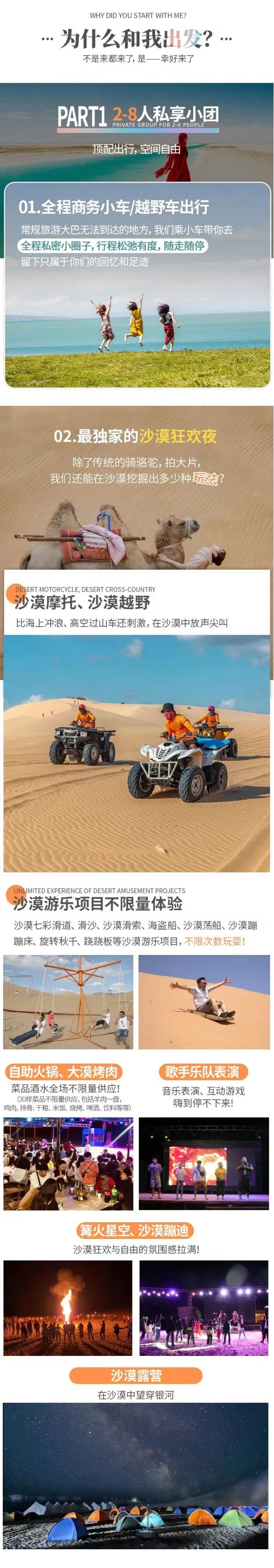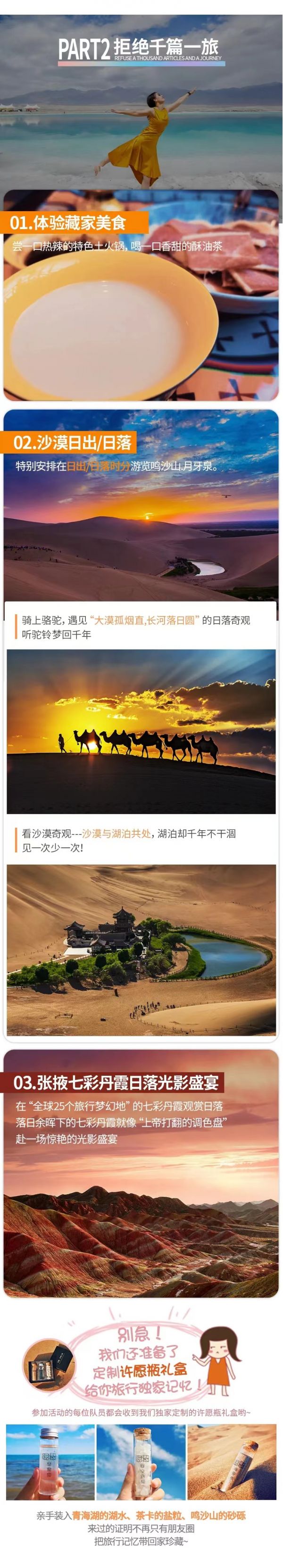 從石油小鎮(zhèn)出來隨后直達【敦煌】如時間充裕可參觀敦煌古城 ,最后我們抵達千年古城敦煌,有人說過,這里的風都有歷史的氣息。今晚我們特地安排了沙漠露營!沙漠露營為贈送項目,可根據(jù)自己身體狀況自行選擇。包括沙漠摩托、滑沙、土火鍋、啤酒烤肉、沙漠演唱會、煙花表演、篝火晚會、鍋莊舞,之后分發(fā)帳篷睡袋在大漠星空下露營,銀河系清晰可見任何時節(jié)只要天空晴朗都可看見流星。