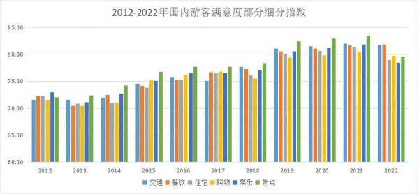 滿意度調(diào)查數(shù)據(jù)顯示,2012-2021年,城市交通、餐飲、住宿、購物、娛樂、景點(diǎn)細(xì)分滿意度指數(shù)不斷提升。2012-2015年各細(xì)分指標(biāo)處于“一般滿意”區(qū)間,2015-2018年各細(xì)分指標(biāo)升至“基本滿意”區(qū)間,2019年起各細(xì)分指標(biāo)向“滿意”區(qū)間靠近,2021年各細(xì)分指標(biāo)均達(dá)到滿意水平。2022年以來,游客對(duì)交通、餐飲等方面的滿意首次超過景區(qū)景點(diǎn)。