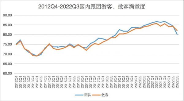 根據(jù)各季度統(tǒng)計(jì)數(shù)據(jù),2012年至2022年游客綜合滿意度指數(shù)從2012年第四季度的74.56提升到2022年第三季度的79.35,其間滿意度最高值出現(xiàn)在2021年第三季度(82.71)。此外,2020年、2021年、2022前三季度游客滿意度分別為80.95、82.47、80.63。