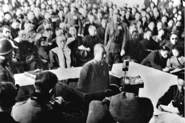 這是抗日戰(zhàn)爭(zhēng)勝利后,制造南京大屠殺的主要罪犯、日軍第6師團(tuán)師團(tuán)長(zhǎng)谷壽夫被押上審判臺(tái)并被處死刑。
