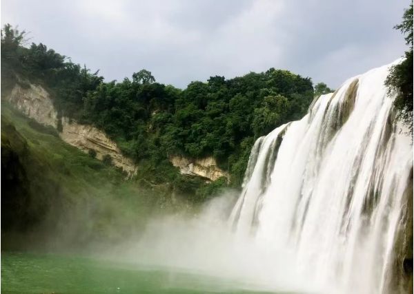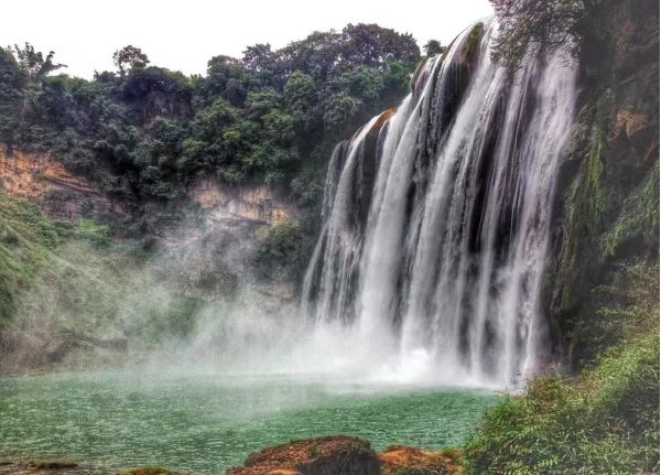 徐霞客描寫(xiě)黃果樹(shù)瀑布:“透隴隙南顧,則路左一溪懸搗,萬(wàn)練飛空,溪上石如蓮葉下覆,中剜三門(mén),水由葉上漫頂而下,如鮫綃萬(wàn)幅,橫罩門(mén)外,直下者不可以丈數(shù)計(jì),搗珠崩玉,飛沫反涌,如煙霧騰空,勢(shì)甚雄厲;所謂‘珠簾鉤不卷,飛練掛遙峰’,俱不足以擬其壯也。”在他所見(jiàn)的瀑布中,“高峻數(shù)倍者有之,而從無(wú)此闊而大者”。從那時(shí)起,黃果樹(shù)瀑布就逐漸被人們認(rèn)為是全國(guó)第一瀑布。