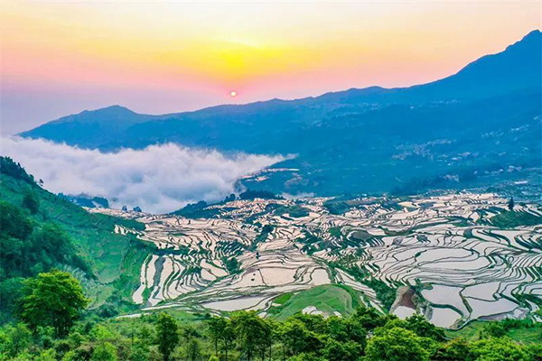 位于元陽(yáng)縣境內(nèi)的多依樹梯田,是觀看日出的絕佳地點(diǎn)。哀牢山重巒疊嶂,萬(wàn)畝梯田鑲嵌其中。