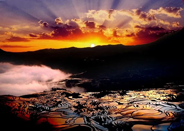 早晨,太陽(yáng)的光芒噴薄而出,萬(wàn)道霞光將天邊的云,地上的梯田都染上顏色。