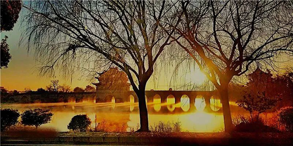 清晨,太陽(yáng)沖破地平線,陽(yáng)光從建水縣雙龍橋的橋孔下穿射而出,宛如油畫般的場(chǎng)景,就這樣展現(xiàn)在眼前?!敖鸸獯┒础比鐗?mèng)似幻,絢麗光芒灑在江面上、屋頂上……好像給雙龍橋鍍上了一層溫柔的濾鏡無(wú)盡浪漫。
