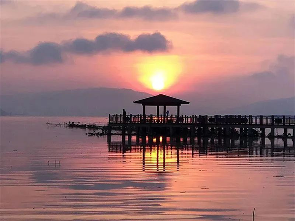 “金光穿洞”如夢(mèng)似幻,絢麗光芒灑在江面上、屋頂上……好像給雙龍橋鍍上了一層溫柔的濾鏡無(wú)盡浪漫。