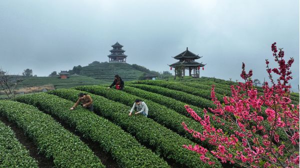 春暖花開(kāi),萬(wàn)物復(fù)蘇。近日,廣西三江侗族自治縣八江鎮(zhèn)布央村仙人山茶園內(nèi)桃花迎春怒放,春茶初露嫩芽,游客愜意采摘,與山上的特色廊亭、縹緲云霧相互映襯,構(gòu)成一幅迷人的春景圖。