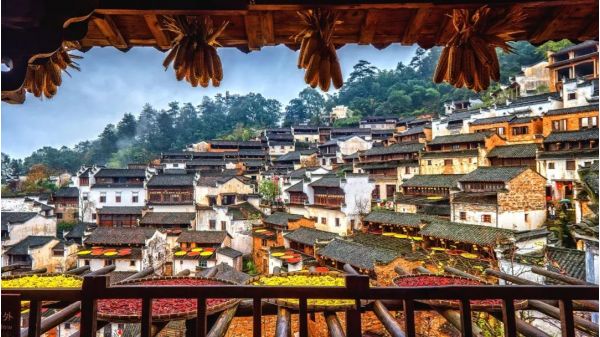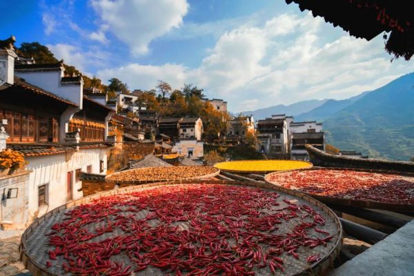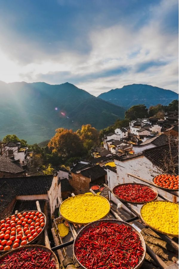 每到豐收時(shí)節(jié),陽(yáng)光下數(shù)百棟錯(cuò)落的徽派民居,和曬架上五彩繽紛的豐收成果構(gòu)成絢爛的“曬秋”景觀。