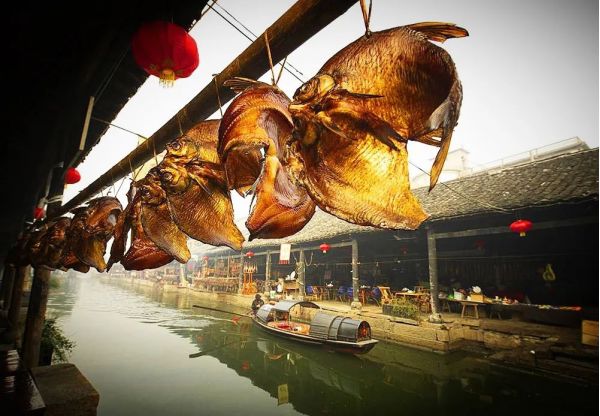 臘腸,熏魚(yú),整雞,整鴨,就著暖陽(yáng)泛出別樣光澤,零零落落懸掛河岸兩旁,那光景甚是討喜。
