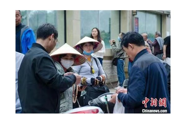 “我剛從越南過來,請幫忙開個張?!狈妒舷阌靡豢诹骼闹形牧幵缡小伴_門紅”,并向記者展示她的邊境通行證,她的單肩挎包里裝有紅木、黑檀、沉香等不同材質(zhì)的手串,手上也戴著數(shù)串向游客展示。范氏香說,她恢復這項營生已經(jīng)十來天,前一天賺了100多元(人民幣,下同)利潤。