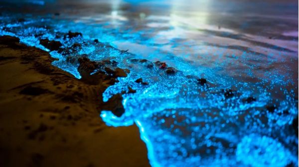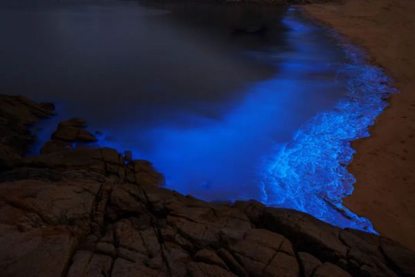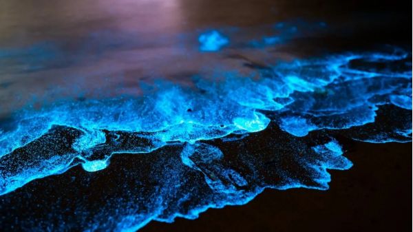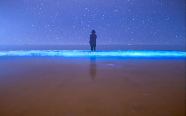 藍(lán)色的熒光隨著浪花,一陣一陣撲面而來(lái),猶如天上的星星墜落,在暗夜海岸之上,散發(fā)幽微又明亮的美,震懾人心又勾人魂魄。
