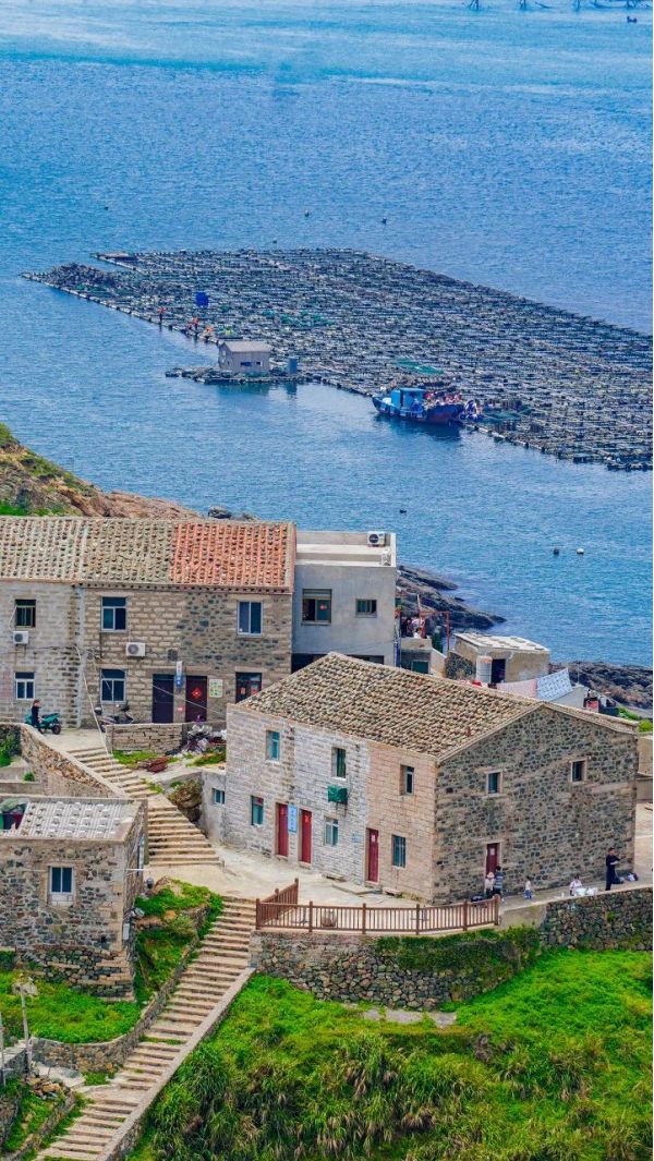 山嶺、石厝、古樹、海景相互掩映,一座座石厝背山面海而建。