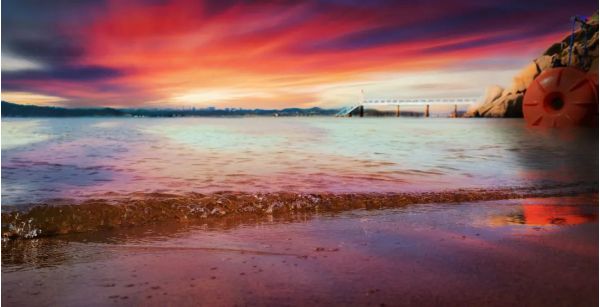 海岸線散發(fā)著迷人霞光,給巖石鍍上一層華麗的金黃,到處都跳躍著暖光,霞光灑落在平靜的湖面上,微風(fēng)吹來(lái),湖面上泛起了層層波浪。