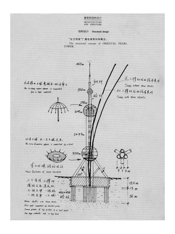 東方明珠廣播電視塔主體為多筒結(jié)構(gòu),由3根斜撐、3根立柱及廣場、塔座、下球體、5個(gè)小球體、上球體、太空艙、發(fā)射天線桅桿等構(gòu)成,主體結(jié)構(gòu)高350米,總高468米,總建筑面積達(dá)10萬平方米。