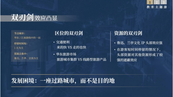 然而,隨著紹興教育主題游的發(fā)展,區(qū)位的雙刃劍效應(yīng)越來(lái)越突出。交通的便利讓游客來(lái)得快,走得也容易。魯迅、蘭亭等文化IP吸引力強(qiáng),但是在短時(shí)間的停留期內(nèi),這些頭部IP對(duì)其他資源和文化形成了較強(qiáng)的遮蔽效應(yīng)。于是, “過(guò)路型城市,游客留不下來(lái)”成為紹興研學(xué)在這一階段面臨的發(fā)展困境。