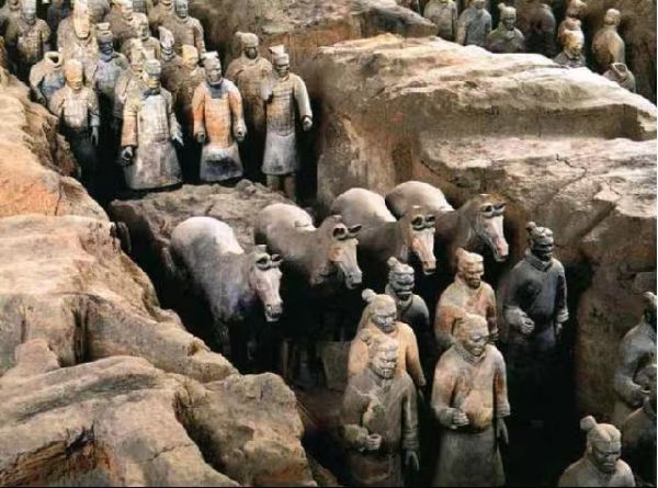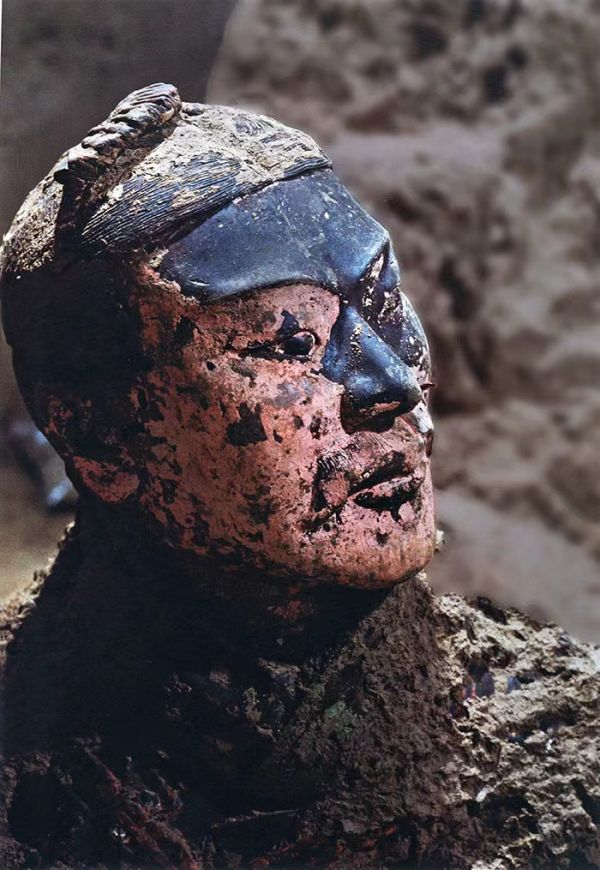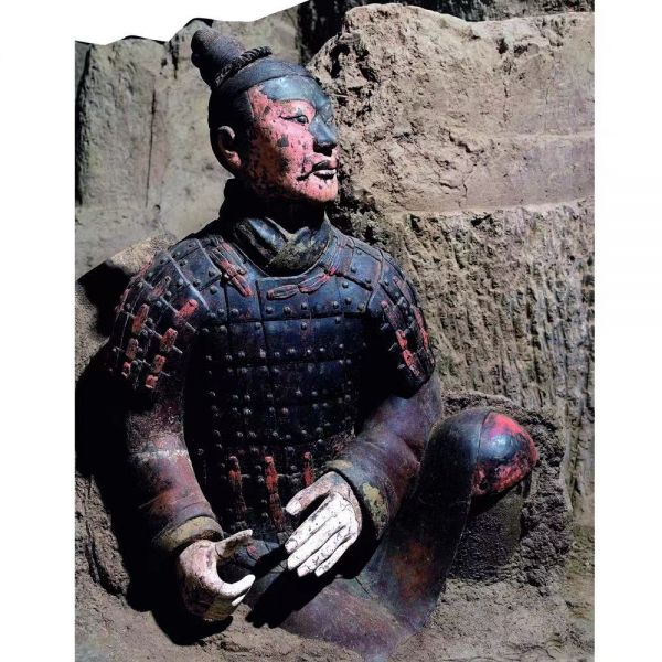 當初的兵馬俑都有鮮艷和諧的彩繪,發(fā)掘過程中發(fā)現有的陶俑剛出土時局部還保留著鮮艷的顏色,但是出土后由于被氧氣氧化,顏色不到十秒鐘瞬間消盡,化作白灰?,F在能看到的只是殘留的彩繪痕跡。