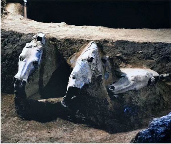 秦始皇陵兵馬俑陪葬坑坐西向東,三坑呈品字形排列。最早發(fā)現的是一號俑坑,呈長方形,坑里有8000余兵馬俑,四面有斜坡門道。一號俑坑左右兩側各有一個兵馬俑坑,稱二號坑和三號坑。