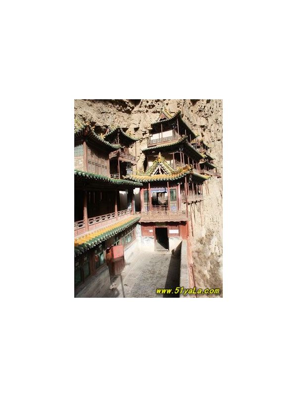 北岳恒山風(fēng)景區(qū)內(nèi)的另一處重要景觀是懸空寺。懸空寺位于北岳恒山腳下、渾源縣城南5公里處的金龍峽內(nèi)西巖峭壁上。寺創(chuàng)建于北魏后期(約為公元471—523年),現(xiàn)存建筑分明清兩代修建后的遺物。懸空寺靠西面東,儼若精巧、別致、玲瓏剔透的玉雕懸于一幅巨大的屏風(fēng)上。寺內(nèi)共有殿宇樓閣40間。南北,有三檐歇山頂危樓聳起,對峙而立,由低向高三層疊起,離地百余尺,附于絕壁上,三面環(huán)廊國抱、六座殿閣,相互交叉,飛架棧道相連,高低錯落,木制樓梯溝通,遷回曲折,構(gòu)思布局妙不可言、整個寺面似虛而實,似危而安,實中生巧,危里見俏,一種在國內(nèi)其它寺廟中體會不到的奇險感緊緊地抓住游人的好奇心理。懸空寺內(nèi)塑像頗多,有銅鑄、鐵鑄、泥塑、石雕像共78尊。三圣殿內(nèi)的泥塑,具有唐、明兩代風(fēng)韻,釋迎、韋馱、天女、阿難形體豐滿,神彩動人,仙女婀娜、韋馱英武、阿難虔誠,各具風(fēng)彩。三教殿內(nèi),釋迦牟尼、老子、孔子三教臺流,共居一室,耐人尋味、始祖同堂,堪稱中國宗教史上的一段佳話。懸空寺內(nèi),有朝殿、會仙府、碧霞宮、純陽宮、樓臺亭、寢宮、梳妝樓、御碑亭等。